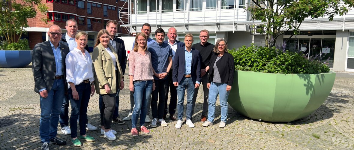 Reiner Tippkötter (energielenker Greven), Alina Willner (Stadtplanerin Stadt Emsdetten), Ilga Schwidder (Geschäftsführerin der Bundesgeschäftsstelle eea), Dennis Röhrs (Kaufmännisches Gebäudemanagement Stadt Emsdetten), Betina Loddenkemper (Klimamanagerin Stadt Emsdetten), Philipp Bunse (Fachdienstleitung Stadtentwicklung und Umwelt Stadt Emsdetten), Bürgermeister Oliver Kellner, Mona Neubaur (Ministerin für Wirtschaft, Industrie, Klimaschutz und Energie des Landes Nordrhein-Westfalen), Frank Westkamp (Technisches Gebäudemanagement Stadt Emsdetten)Projekte