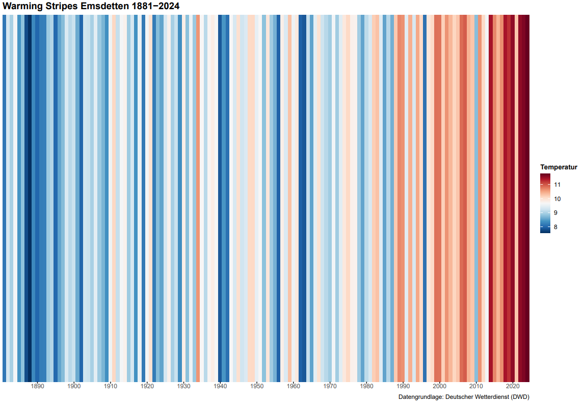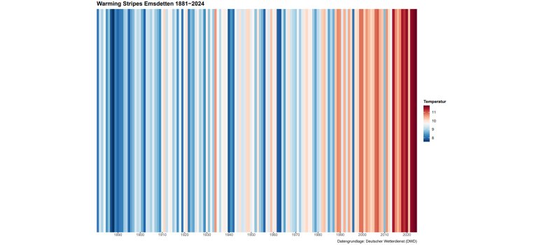 Die folgende Abbildung zeigt die Warming Stripes für Emsdetten. Demnach war hier das kälteste Jahr 1888 mit einer Jahresdurchschnittstemperatur von 7,6°C. Das wärmste gemessene Jahr war 2024 mit einem Wert von 11,7°C im Jahresdurchschnitt.
