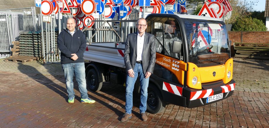 Auf dem Bild v.l.n.r.: Sven Mendelin, Teamleiter des Baubetriebshofes und Bürgermeister Oliver Kellner begutachteten bei bestem Wetter den frisch gelieferten Goupil G5.