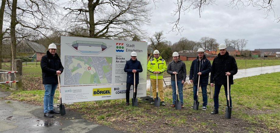 Auf dem Foto v.l.n.r.: Simon Wieler (Fachdienstleiter Straßen und Entsorgung der Stadt Emsdetten), Oliver Kellner (Bürgermeister der Stadt Emsdetten), Dennis Hilling (Baufirma Börgel GmbH & Co. KG), Hendrik Hemesath (W & B Ingenieure GmbH), Josef Feldmann (Eigentümer der Brücke), Martin Dörtelmann (Technischer Beigeordneter der Stadt Emsdetten)
