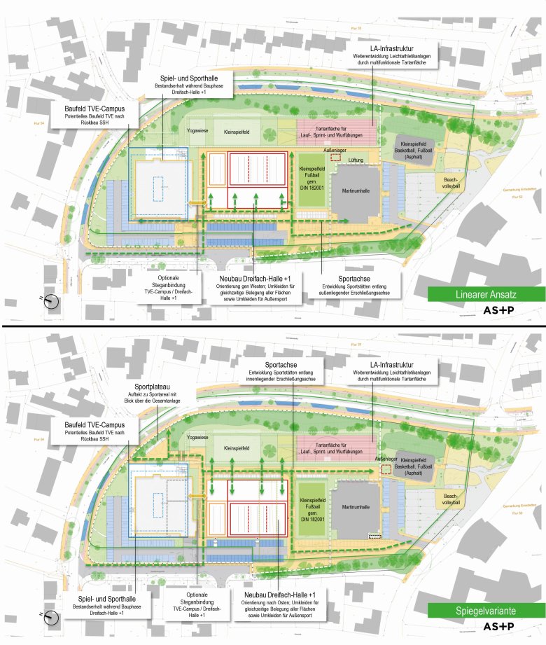 Der wesentliche Unterschied zwischen den beiden vorgestellten Varianten liegt in der Verortung der Eingangssituationen und der damit verbundenen Zonierung der Nutzungen innerhalb der Gebäude sowie der Wegeführung für zu Fuß Gehende und Radfahrende. Während die Erschließung in der „linearen Variante“ ausschließlich über die Stauffenbergstraße erfolgt, ist in der „gespiegelten Variante“ eine Zugänglichkeit des gesamten Areals für zu Fuß Gehende und Radfahrende über eine neue fußläufige Anbindung an die Straße In der Lauge vorgesehen. Neben kürzeren Wegen für zu Fuß Gehende und Radfahrende hätte dies auch den Vorteil, dass diese Verkehrsteilnehmenden unabhängig vom Kfz-Verkehr geführt werden können und das Umfeld der Hallenbauten und Sportflächen in Verbindung mit der Anbindung der Wege sowie der damit einhergehenden Aufenthaltsflächen belebt und attraktiviert wird.