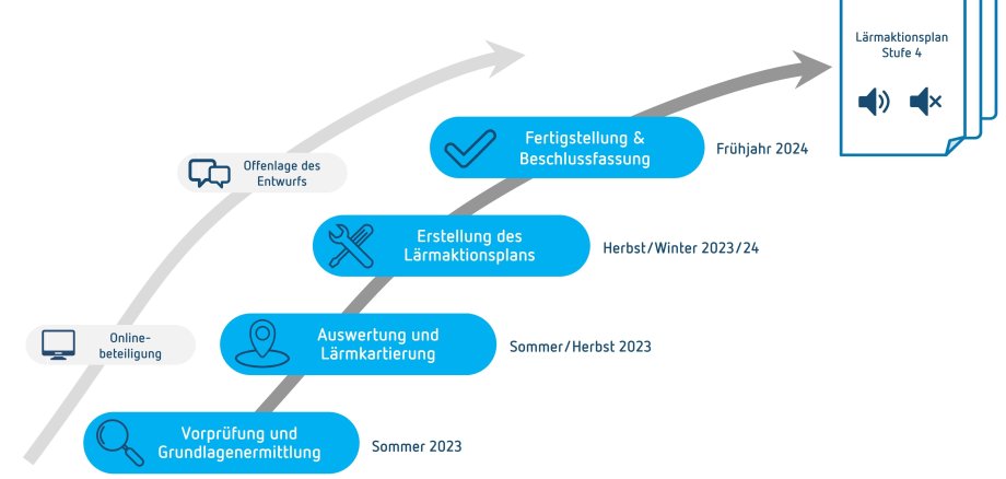 Im Anschluss wird der Entwurf des Lärmaktionsplanes erarbeitet, welcher dann der Politik präsentiert und im Rahmen einer Auslage der Öffentlichkeit und den Trägern öffentlicher Belange zur Einsicht gegeben wird. Erneut haben die Bürgerinnen und Bürger dann die Möglichkeit, den Plan zu kommentieren und eine Stellungnahme zu den Inhalten und Maßnahmen abzugeben.