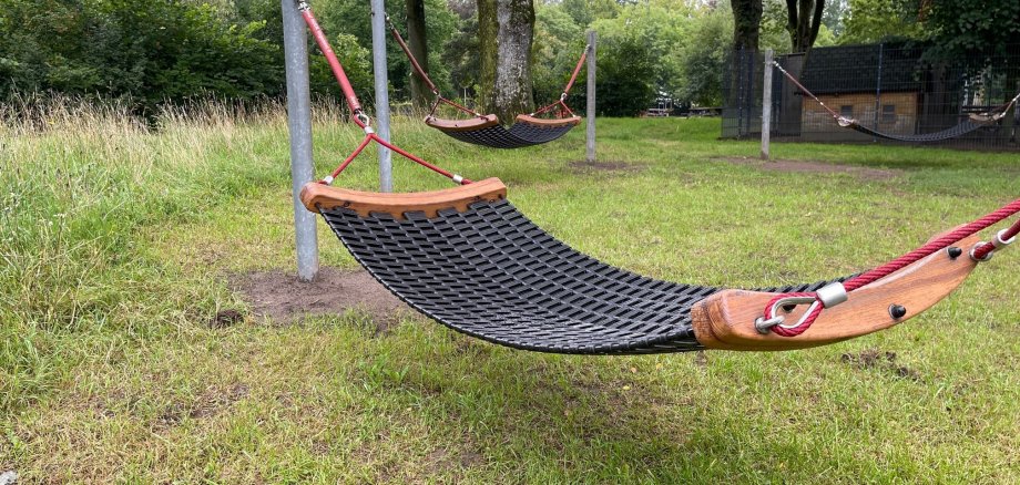 Drei neuinstallierte Holz-Hängematten laden zum Verweilen und Ausruhen ein. Die Hängematten stammen aus Lagerbeständen des Baubetriebshofes. Auch hier wurde das Holz aufbereitet. Einer Nutzung steht nun nichts mehr im Wege.