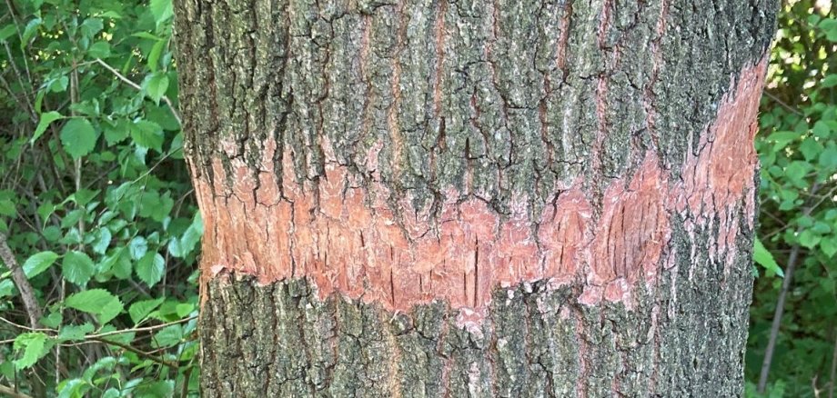 An einer Eiche wurde im kompletten Umfang die Rinde abgeschält.