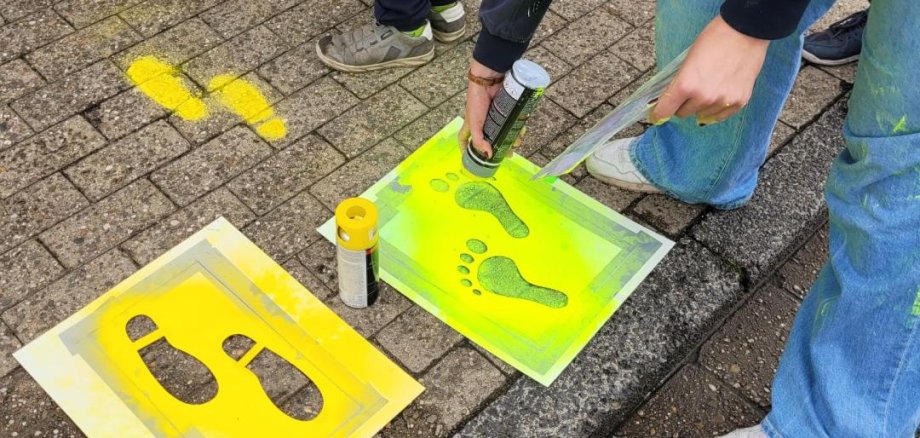 Im Anschluss teilten sich die Kinder in zwei Gruppen – je nach Wohnort ging es Richtung Norden oder Süden. Entlang der Route wurden gelbe Füße mit Kreidefarbe aufgesprüht, um den Laufweg zu markieren und andere Verkehrsteilnehmende auf den Schulweg aufmerksam zu machen.