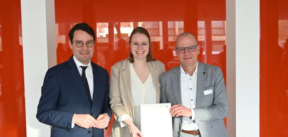 Am Mittwoch, 21. Januar 2026, nahm Bürgermeister Oliver Kellner gemeinsam mit Julia Kümper vom Team Fördermanagement und Vergabe der Stadt Emsdetten nun den offiziellen Förderbescheid von Regierungspräsident Andreas Bothe entgegen. Mit dem Erhalt des Bescheides kann die Maßnahme nun auch formal abgeschlossen werden.