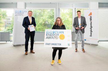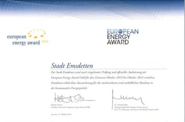 Der European Energy Award (eea) steht europaweit für ausgezeichneten Klimaschutz – und macht die Erfolge einer Kommune bei Energieeffizienz und Klimaschutz mess- und sichtbar. Es handelt sich um ein internationales Zertifizierungsverfahren. Die regelmäßigen Auszeichnungen bescheinigen, dass die angegangen und umgesetzten Maßnahmen der Stadt für eine nachhaltige und vorausschauende Energie- und Umweltpolitik erfolgreich waren und die erreichten Ziele den hohen Anforderungen der Zertifizierung entsprachen. Europaweit wurden über 800 Kommunen mit dem eea ausgezeichnet, mehr als 1.500 Kommunen und Landkreise aus 16 europäischen Ländern nehmen aktuell am Zertifizierungsprozess teil. Die Webseite des European Energy Awards (www.european-energy-award.de) hält detaillierte Informationen zum Punktesystem und zu den teilnehmenden Kommunen (u.a. Emsdetten) bereit. Hier kann auch ein Vergleich der teilnehmenden Kommunen (Benchmark) abgerufen werden.