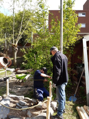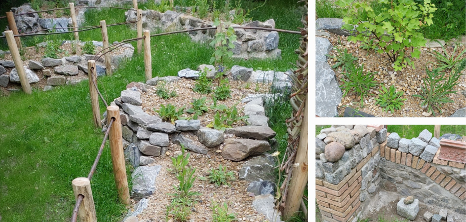 Neben dem Rutschenhügel, entlang der Benjes-Hecke fast bis zur Grundstücksgrenze entstanden an gemeinsamen Aktionstagen „Natur-Zonen“, kleine „Inseln“, die mit Insektenfreundlichen Sträuchern, Stauden und Wildpflanzen bepflanzt wurden. Besonders Schmetterlinge und andere Falterarten, aber auch Wildbienen sollen angelockt werden. Dafür mussten die Bereiche terrassiert und mit Sandsteinen abgefangen werden, der Boden wurde gegen ein Magersubstrat ausgetauscht, das ebenfalls Insekten anlockt. Kleine „Zäune“ aus Weiden entstanden, um das Wachstum zu schützen. Zwischen den „Natur-Zonen“ entstanden so spannende Wege für die Kinder, wo es zukünftig viel zu erforschen und zu entdecken gibt.