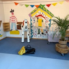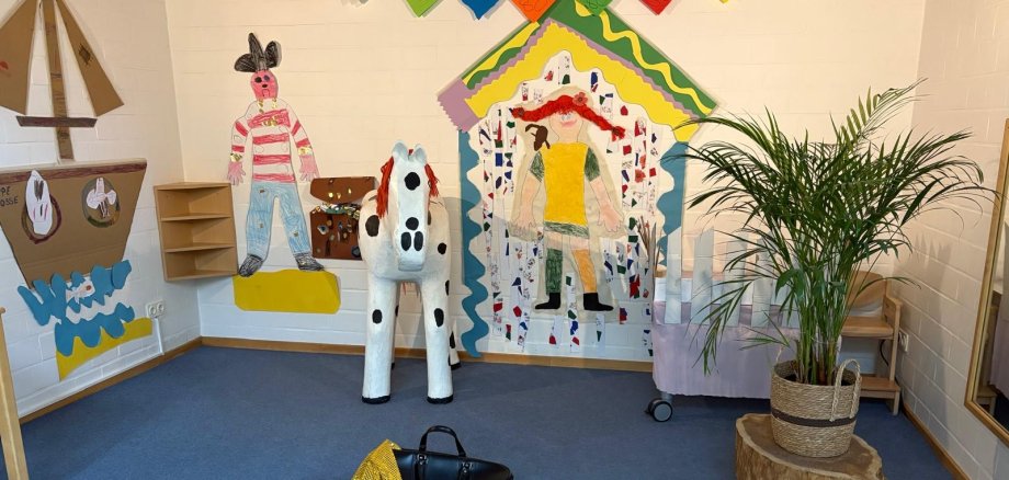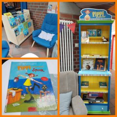 Auch andere Pippi-Abenteuer wurden in den Leseecken entdeckt – in einem Raum entstand eine große Pippi-Kulisse mit Villa Kunterbunt, Hoppetosse, kleiner Onkel und Herr Nielsson – auch der Goldkoffer durfte nicht fehlen!