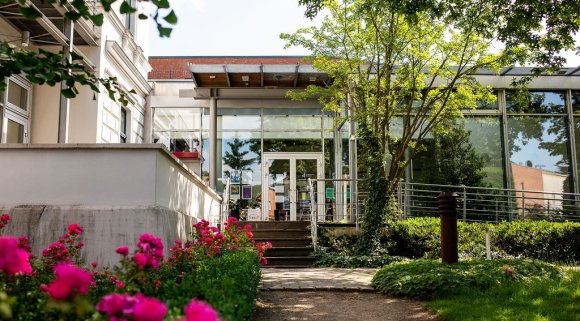 Beim Entwurf des Bibliotheksanbaus ließen sich die Architekten von zwei Grundsätzen leiten: einerseits eine zeitgemäße Replik auf die klassizistische Villa, andererseits einen offenen Ort der Begegnung und des Austauschs zu schaffen. Dieser Gedanke findet sich in der transparenten und fließenden Raum– und Grundrissposition wieder.