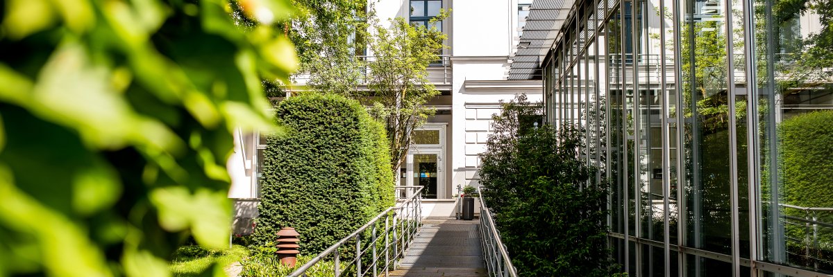 So kontrastiert der zurückhaltende und transparente Neubau mit seinen schlichten Materialien mit der unter Denkmalschutz stehenden Villa. Eine Glasnut trennt das neue Dach von den alten Fassaden. Im Inneren sind die beiden Gebäude mit Öffnungen und Durchblicken verbunden. Alte Fenster dienen heute als offene Verbindungen. Die optische Durchlässigkeit findet ihre Entsprechung in der räumlichen Verzahnung beider Gebäude.