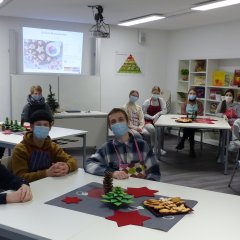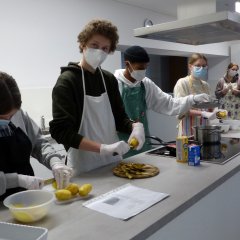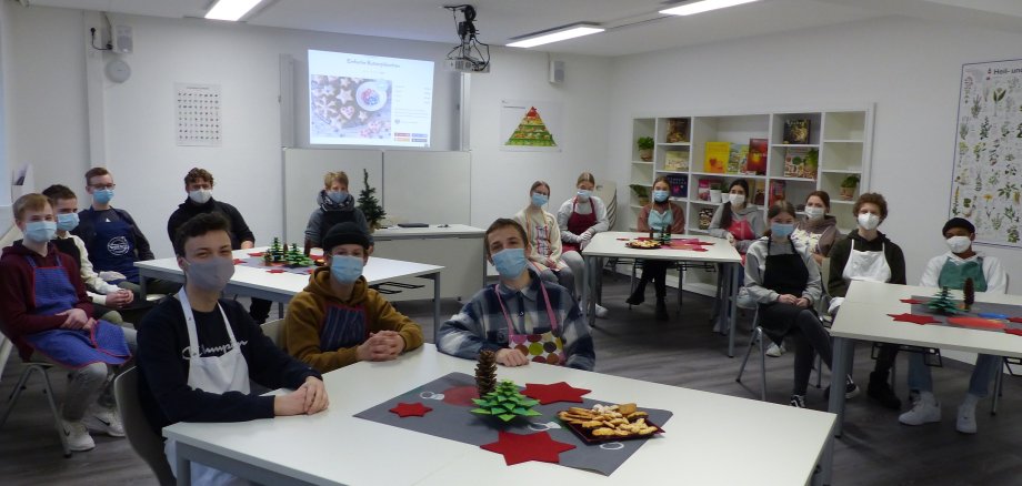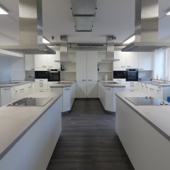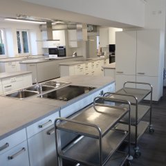 Die neue Schulküche verfügt über acht separate Arbeitsbereiche mit vier Induktionsfeldern, vier Mikrowellen, vier Backöfen, einen Dampfgarer, zwei große Kühlschränke, eine Gefriertruhe, vier Spülstationen, Geschirrspüler, Waschmaschine und Kondensat-Trockner. Bei allen Elektrogeräten wurde darauf geachtet, dass sie energiesparend betrieben werden. Über das Whiteboard können die Schülerinnen und Schüler schnell und flexibel Rezepte und andere Informationen für den Hauswirtschaftsunterricht abrufen und nutzen.