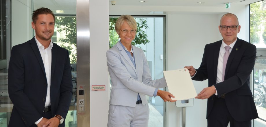 Bildunterschrift: Bürgermeister Oliver Kellner (rechts) und Fördermanager Joscha Blum (links) freuen sich über den Förderbescheid von Regierungspräsidentin Dorothee Feller (Mitte)