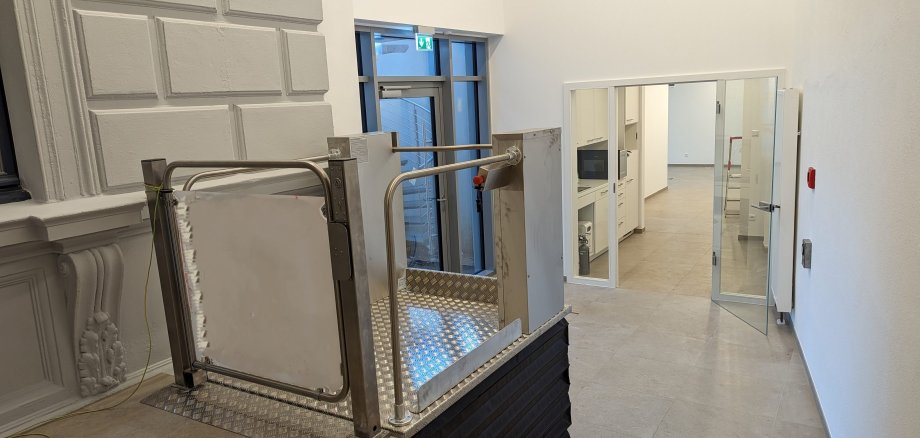 Die Bauarbeiten am Anbau der Stadtbibliothek gehen damit in den Endspurt. Vor wenigen Tagen wurde ein Treppenlift, der zum Anbau und auch zum zukünftigen öffentlichen Eingang von Seiten der Kirchstraße führt, installiert.