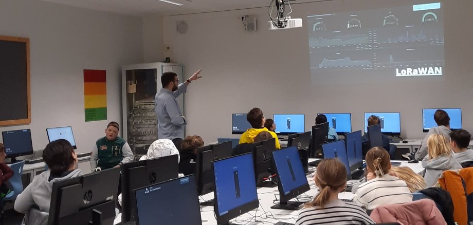 Nach einem kurzen Erläuterungsfilm zur Einführung in die Thematik war den Schülerinnen und Schülern die Antwort schnell klar: „Es geht um die Digitalisierung in den Städten, durch die auch in Emsdetten bereits viele Prozesse optimiert wurden!“. So ging es anschließend um konkrete Beispiele der Smart City-Aktivitäten der Stadt Emsdetten: die städtische Grünflächenbewässerung, Informationen zur Verkehrsanalyse sowie unterschiedliche Modelle im Bereich Parksensoren. Janine Scheipermeyer (Auszubildende zur Verwaltungsfachangestellten bei der Stadt Emsdetten), die den Besuch ebenfalls begleitete, gab den Schülerinnen und Schülern zudem einen Einblick in ihre eigenen Erfahrungen im Bereich Digitalisierung im Rahmen der Ausbildung bei der Stadtverwaltung.