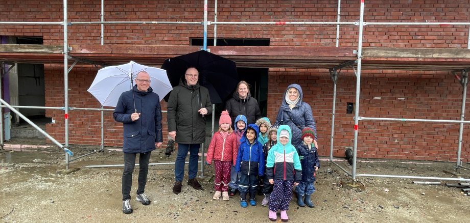 Frank Westkamp, Teamleiter Technisches Gebäudemanagement der Stadt Emsdetten, zeigte den Anwesenden zunächst, wie das Kinderhaus am Silberweg aufgebaut sein wird. Besonders interessierten sich die Kinder und ihre Erzieherinnen Laura Bülte und Nourulhuda Al Mnajjed für den Außenbereich. Dort erwartet sie neben einem Trampolin auch ein Klettergerüst und ein Matschbereich – an dem derzeit schon fleißig gearbeitet würde, wie Elmar Leuermann mit Blick auf die vielen Pfützen augenzwinkernd anmerkte.
