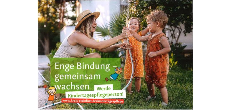 Für alle Eltern, die im Kindergartenjahr 2024/2025 mit der Kindertagespflege beginnen, findet anschließend an die Aktionswoche am Montag, 22. April 2024, um 19.00 Uhr im Ratssaal des Emsdettener Rathauses eine Informationsveranstaltung statt. Teil der Veranstaltung werden unter anderem die allgemeinen Rahmenbedingungen wie zum Beispiel Verträge für die Kindertagespflege sein.