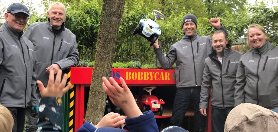 Daher bildete das Unternehmen vier Projektteams – eines davon engagiert sich sozial. Thomas Borgmann, Mitarbeiter der Firma und Vater eines Sohnes, der das Kinderhaus Maria Sibylla Merian besucht, erfuhr von der morschen Bobby-Car-Garage der Kita. Nach einem Gespräch mit Einrichtungsleiterin Martina Münstermann beschloss er, für Ersatz zu sorgen. Und das tat er – zusammen mit weiteren Mitarbeitenden aus allen Bereichen der Firma BOS, die von der Idee über die Planung und Umsetzung bis hin zur Logistik am gelungenen Projekt Bobby-Car-Garage beteiligt waren.