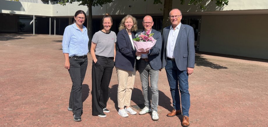 Am Dienstag, 27. August 2024, überbrachten Bürgermeister Oliver Kellner, der Erste Beigeordnete Elmar Leuermann und Kathrin Magnus als Fachdienstleitung Bildung, Sport und Kultur der Stadt Emsdetten die besten Glückwünsche der Stadtverwaltung und hießen die neue Schulleitung herzlich willkommen.