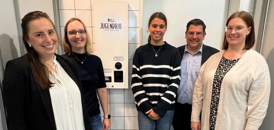 Gesa Marwede, Jugendratsmitglied und Schülersprecherin aus der 12. Klasse des Gymnasiums Martinum und Schulleiter Olaf Cimanowski nahmen gemeinsam mit Lisa Bohle vom Jugendamt der Stadt Emsdetten, Dana Hagendorf und Chantal Uphoff (beide Bildung, Sport und Kultur der Stadt Emsdetten) den Hygieneautomaten in Augenschein.