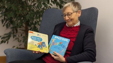 Vorlesepatin Dagmar Linke bringt zwei Pappbilderbücher für Kinder im Altern von zwei bis drei Jahren mit. „Krank sein? Lieber nicht!“ von Martin Baltscheit, illustriert von Claudia Weikert und „Farben“ von Roald Dahl, mit Bildern von Quentin Blake. Damit alle Kinder gut sehen können, werden die Bilder auf einer großen Leinwand gezeigt.