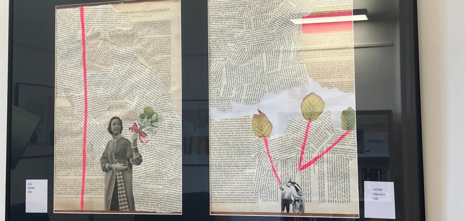 Ergänzt wird die Ausstellung durch kreative Collagen aus alten Büchern unter dem Titel „Old books, new look“. Hier haben die Schülerinnen und Schüler der Jahrgangsstufe zehn neue visuelle Schwerpunkte gesetzt, etwa zu „Tanz/Bühne“, „Natur“, „Liebe“ oder „Fernweh“.