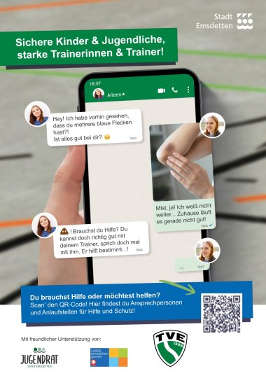 An der Gestaltung des ersten Plakates war der Jugendrat der Stadt Emsdetten aktiv beteiligt. Gemeinsam überlegten die Jugendlichen, welche Motive, Abbildungen oder textlichen Ausführungen die Aufmerksamkeit der Zielgruppe für das Plakat erhöhen. Im Ergebnis entstand dabei ein Chatverlauf in jugendlicher Sprache zwischen Freundinnen. Über den zusätzlich abgebildeten QR-Code, der einfach und unkompliziert mit dem Smartphone gescannt werden kann, öffnet sich eine Unterseite auf der städtischen Internetseite, die Ansprechpersonen und Anlaufstellen für Hilfe und Schutz aufführt. Das erste Motiv der Kampagne widmet sich dem Thema körperliche Gewalt. Weitere Ideen werden nun sukzessive mit dem TVE entwickelt und umgesetzt.