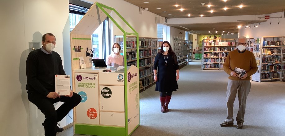 Neben dem Leiter der Stadtbibliothek Christoph Höwekamp (links) freuen sich auch die ehrenamtliche Deutschlehrerin Renate Donaszewski (2.v.l.) und der ehrenamtliche Deutschlehrer Edwin Mock (rechts) sowie die Integrationsbeauftragte der Stadt Emsdetten Eva Kohl (3.v.l.) über das neue Infohaus.