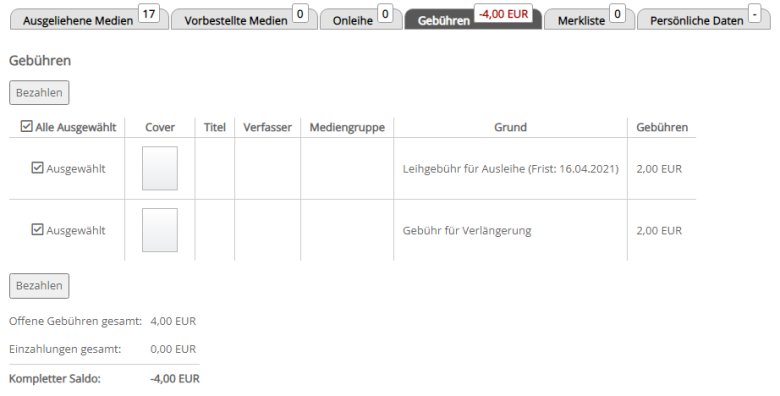 Hier eine beispielhafte Ansicht der Gebührenanzeige im Benutzungskonto: