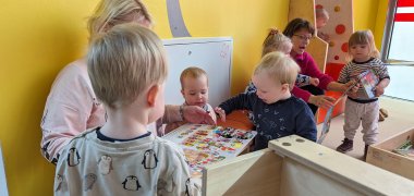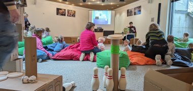 Acht Tagesmütter folgten mit ihren Kindern der Einladung. Die Fachkraft für den Kleinkindbereich der Stadtbibliothek Emsdetten, Bibliothekarin Simone Peters, las den Kindern mit dem Titel „Peppa schützt unsere Erde“ ein Buch zum Thema Nachhaltigkeit vor. Außerdem konnten die Kinder einen Nachhaltigkeitsparcours erproben - bestehend aus Verpackungsmaterial und XXL-Spielen aus der "Gedönsothek".