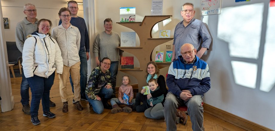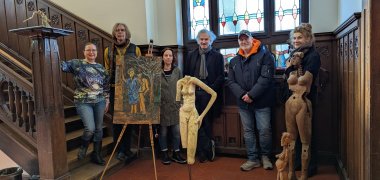 Es war eine Premiere in der Stadtbibliothek: An einem Tag wurde die eine Ausstellung eröffnet. Gleichzeitig endete in Anwesenheit des Künstlers die Ausstellung "Da seid ihr also! von Martin Hermes. Vielen interessierten Gästen erzählte er am 01. Februar Geschichten und Hintergründe zu seinen Kunstwerken. Alle nahm er dann wieder mit, bis auf zwei. Eine Skulptur hat ein neues Zuhause gefunden - und die "Sieben Nothelfer" verbleiben in ihrem Zuhause im Bibliotheksgarten.