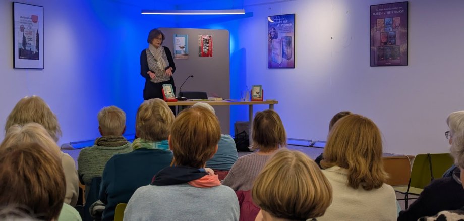 Karin Joachim lockt interessierte Emsdettenerinnen und Emsdettener in die Stadtbibliothek