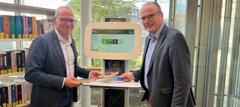 und Elmar Leuermann (Erster Beigeordneter der Stadt Emsdetten) testen den neuen Selbstverbucher aus.