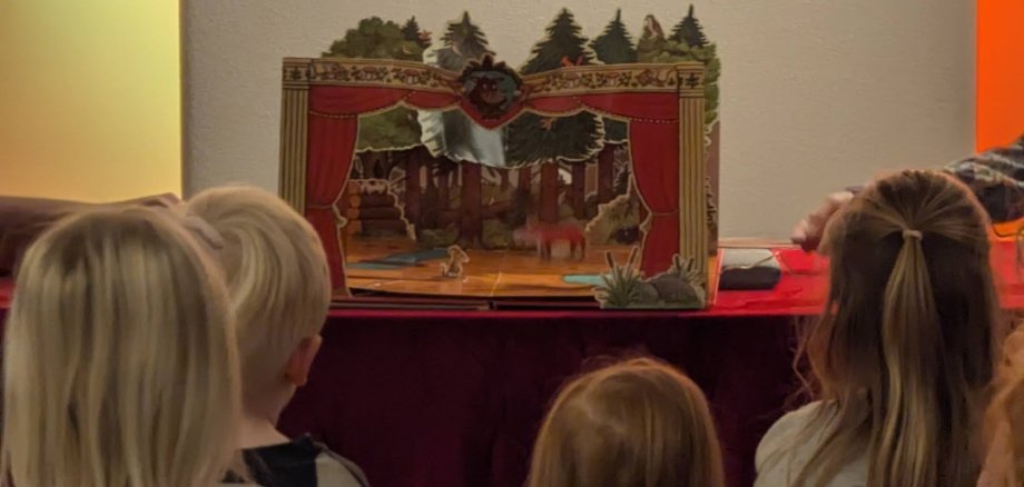 Abschließend präsentierte Vorlesepate Wolfgang Huber um 16.30 Uhr zusammen mit Bibliotheksleitung Kathrin Strähle und Kathrin Magnus (Fachdienstleitung Bildung, Sport und Kultur) das Papiertheater des Bilderbuchklassikers „Der Grüffelo“: Die kleine Maus geht im Wald spazieren. Fuchs, Eule und Schlange versuchen, sie zu fangen und zu fressen. Ob es ihr mit einer listigen Idee gelingen wird, ihre Feinde in die Flucht zu schlagen? Das Publikum durfte nicht nur mitfiebern, sondern auch mitmachen – nämlich die passenden Geräusche zum jeweiligen Tier.