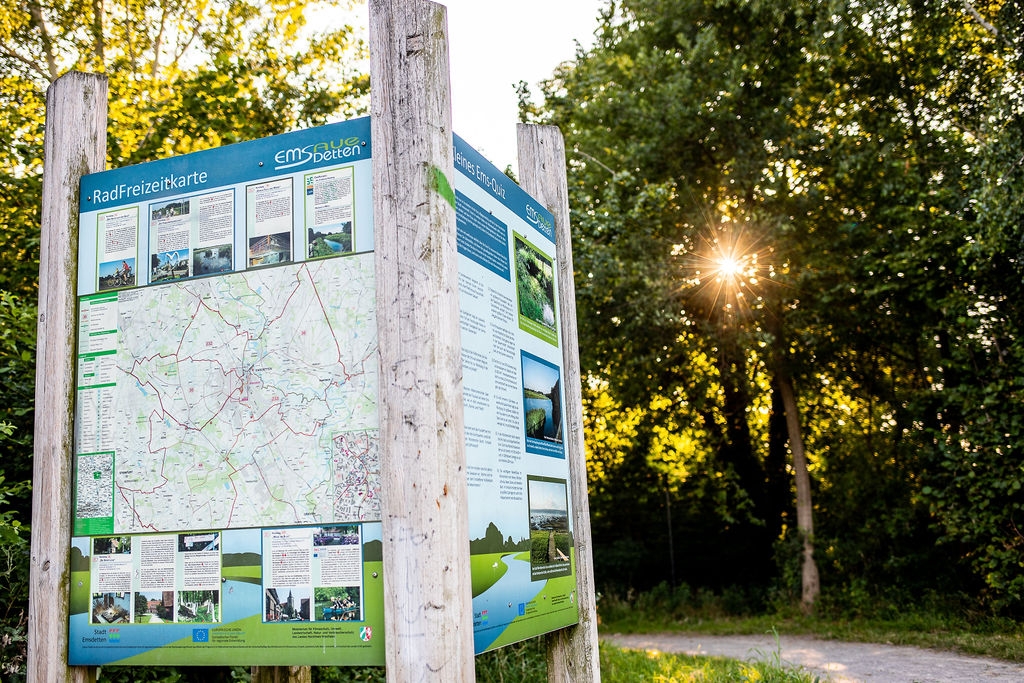 So führt der Emsauenradweg immer der Ems entlang durch das Dorf Hembergen über Austum und durch das Emsdettener Naturschutzgebiet „EmsAue“ mit seinen zahlreichen Rastmöglichkeiten.