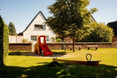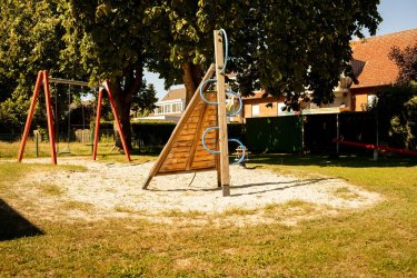 Der Spielplatz verfügt über einige große Bäume, die im Sommer Schatten spenden.