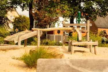 Besonderheiten: Großes Klettergerüst, Seilbahn, Matschtisch, Tisch-Bank Sitzgruppen