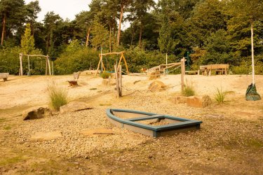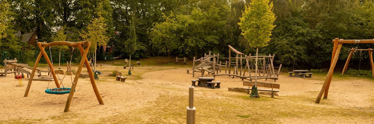 Besonderheiten: Großes Klettergerüst, Seilbahn, Matschtisch, Tisch-Bank Sitzgruppen