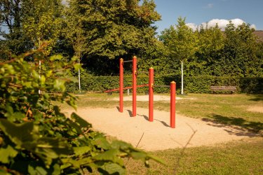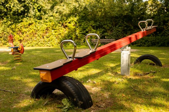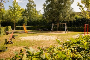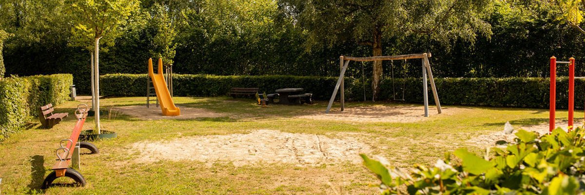 Naturnah eingefasst mit Sitzmöglichkeit unter Bäumen bietet der gern aus der näheren Umgebung angesteuerte Spielplatz viel Platz für freies Spielen neben seinen Angeboten zum Schaukeln, Rutschen und Wippen.