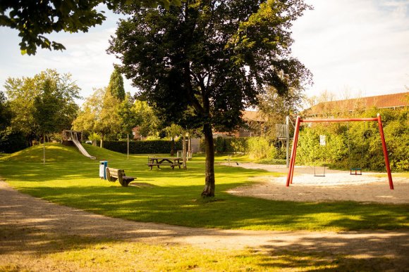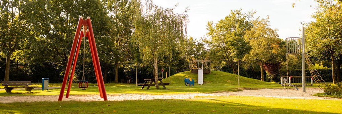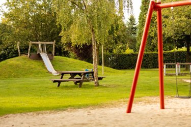 Der mitten im Grünen gelegene Spielplatz bietet neben den Spielgeräten eine große Fläche zum Freispiel. Die in den Hügel integrierte Hangrutsche ist besonders für die jüngeren Kinder interessant. Ein weiteres Highlight ist der Minisandbagger der zum Sandspiel einlädt. Eine Kleinkindschaukel, ein Piraten-Kletterturm und eine Hängebrücke bieten für die Kinder im Grundschul- und Kitaalter ein spannendes Spielerlebnis.