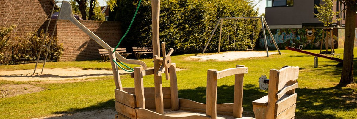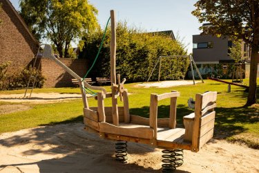 Mit einem großen Klettergerüst bietet er ein interessantes Kletterangebot und durch das Wackelboot gleichzeitig die Möglichkeit zum kreativen Freispiel.