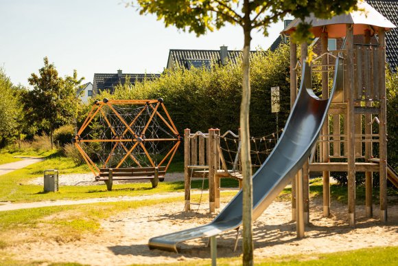 Ein grüner Spielfinger lädt zum spontanen Spiel ein und bietet mit unterschiedlichen Klettermöglichkeiten einiges zu entdecken. Eine Rutsche fehlt natürlich auch nicht.