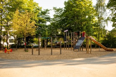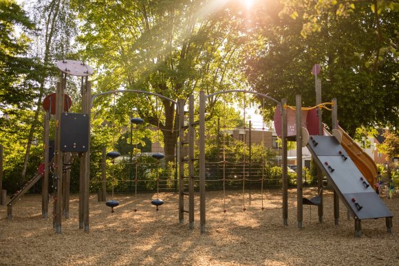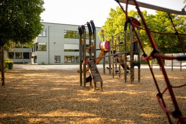 Die attraktive Kletterlandschaft mit unterschiedlichen Schwierigkeitsgraden ist nicht nur für die Grundschulkinder ein Magnet. Reich gespickt mit vielen Elementen sowie Schaukeln und auch Rutschen.