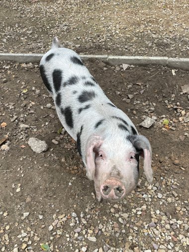 Das bunte Bentheimer Schwein ist ein Landschwein mit langem Rücken und Schlappohren. Über seinen Körper verteilt schmücken es unregelmäßige schwarze Flecken auf weißem oder grauen Grund.