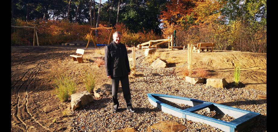 Foto: Bürgermeister Georg Moenikes überzeugte sich persönlich vor Ort von der schönen, kreativen Gestaltung des neuen Spielplatzes an der Blumenstraße, den er fast auf den Tag genau vor 18 Jahren erstmalig eröffnet hat. Eine feierliche Eröffnung mit Kindern konnte aufgrund der Corona-Pandemie dieses Mal leider nicht stattfinden