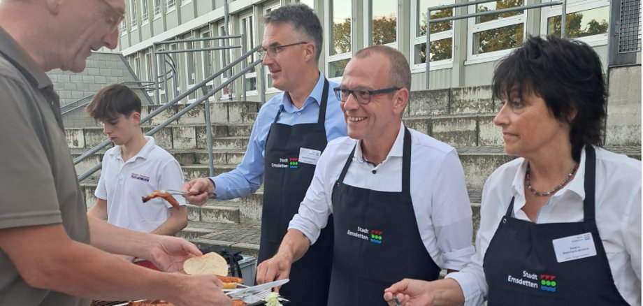 Oliver Kellner, drei der vier stellvertretenden Bürgermeisterinnen und Bürgermeister Ines Brehe, Beatrix Steinbach-Möllers, und Günter Lammert sowie Elmar Leuermann, Erster Beigeordneter der Stadt Emsdetten und Martin Dörtelmann, Technischer Beigeordneter der Stadt Emsdetten, schenkten dabei ein abwechslungsreiches Angebot an Grillgut und Getränken an die Teilnehmenden aus.