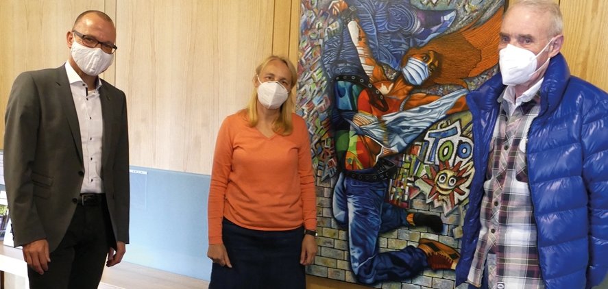Auf dem Bild v.l.n.r.: Bürgermeister Oliver Kellner, Jugendamtsleiterin Petra Gittner und Künstler Bernd Terwey