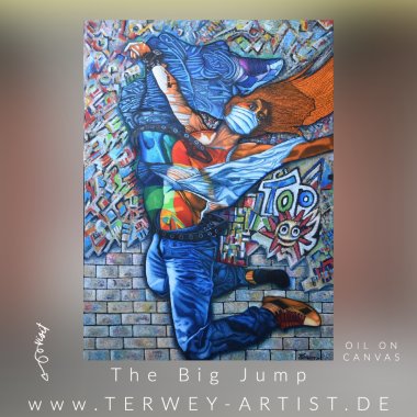 The Big Jump, übersetzt „Der große Sprung“, nennt sich das Werk, das nun die dritte Etage des Rathauses ziert, später womöglich in das neue Familienbüro des Jugendamtes am Morgentaubrunnen umziehen soll. Durch seine intensiven Farben fügt es sich bei beiden Örtlichkeiten jedenfalls gut in die Umgebung ein. Mit dem Motiv nimmt Künstler Bernd Terwey die aktuelle Corona-Pandemie auf und richtet den Fokus auf die weiterhin schönen Seiten des Lebens: „Momentan ist Corona das alles beherrschende Thema und als Künstler setze ich mich in meiner Kunst damit auseinander. Das Gemälde zeigt eine junge Frau in ihrem Sprung aus der Enge in die grenzenlose Freiheit, die es seit dem Lockdown so leider nicht gibt. Mit einer Maske geschützt spürt sie dennoch die innere Freiheit, sie selbst sein zu können und die schönen Momente des Lebens zu erleben“, schildert Terwey.
