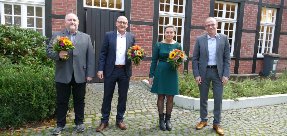Bürgermeister Oliver Kellner mit der Jubilarin und den Jubilaren Heinz Woltering, Thomas Göcke und Brigitte Meiners