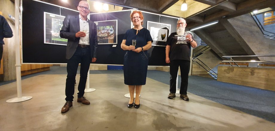Auf dem Bild v.l.n.r.: Bürgermeister Oliver Kellner, Elke Hülskötter (Vorsitzende des Fotoclubs Creativ Emsdetten), Jan van Asveldt (Vorsitzender des HAFV Hengelo)